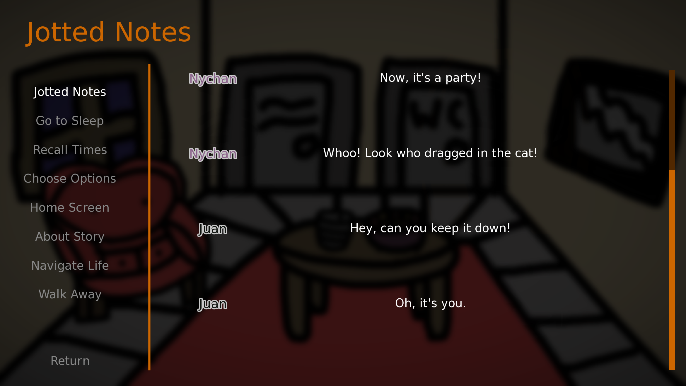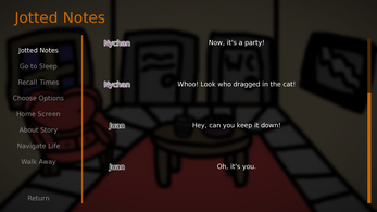 I enjoyed this experience. It felt like it was setting up for something more, so I'm a little curious if there will be a sequel in the future. I also think the font used matches perfectly with the character designs and background art.